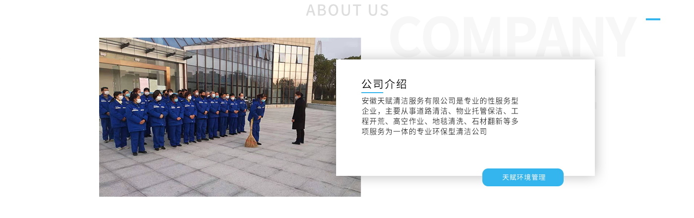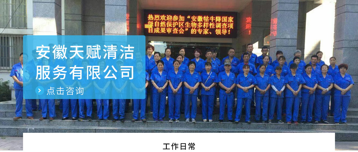 安徽天賦清潔服務有限公司是的服務型企業(yè),主要從事道路清潔、物業(yè)托管保潔、工程開荒、高空作業(yè)、地毯清洗、石材翻新等多項服務為一體的環(huán)保型清潔公司。公司管理機制完善,清潔作業(yè)經(jīng)驗豐富,擁有技術(shù)力量,嚴格實行崗前培訓—崗中督查—上崗在培訓的員工管理措施,憑著優(yōu)良的清潔質(zhì)量和嚴格的督查管理,為眾多企事業(yè)單位、醫(yī)院、酒店、廠區(qū)商場、物業(yè)、道路、學校、公園等提供后勤清潔服務。在業(yè)內(nèi)擁有良好的口碑。工作人員,服務態(tài)度優(yōu),竭力為客戶提供好的保潔服務。安徽天賦清潔服務有限公司:致力于長期合作關(guān)系,提高服務質(zhì)量,提供高標準的清潔服務。公司的經(jīng)營理念:為營造一個更清潔、亮麗的生活和工作環(huán)境而努力!“誠信”是公司成功保證。“客戶至上,信譽為首”是公司宗旨。高標準提供服務,維護客戶利益、形象,是我始終不渝的目標。