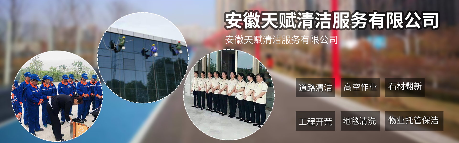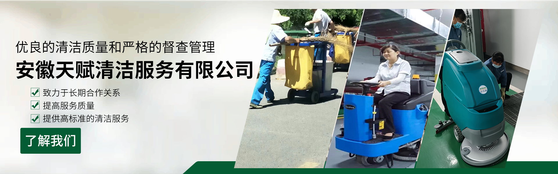 安徽天賦清潔服務有限公司是的服務型企業(yè),主要從事道路清潔、物業(yè)托管保潔、工程開荒、高空作業(yè)、地毯清洗、石材翻新等多項服務為一體的環(huán)保型清潔公司。公司管理機制完善,清潔作業(yè)經(jīng)驗豐富,擁有技術(shù)力量,嚴格實行崗前培訓—崗中督查—上崗在培訓的員工管理措施,憑著優(yōu)良的清潔質(zhì)量和嚴格的督查管理,為眾多企事業(yè)單位、醫(yī)院、酒店、廠區(qū)商場、物業(yè)、道路、學校、公園等提供后勤清潔服務。在業(yè)內(nèi)擁有良好的口碑。工作人員,服務態(tài)度優(yōu),竭力為客戶提供好的保潔服務。安徽天賦清潔服務有限公司:致力于長期合作關(guān)系,提高服務質(zhì)量,提供高標準的清潔服務。公司的經(jīng)營理念:為營造一個更清潔、亮麗的生活和工作環(huán)境而努力!“誠信”是公司成功保證。“客戶至上,信譽為首”是公司宗旨。高標準提供服務,維護客戶利益、形象,是我始終不渝的目標。